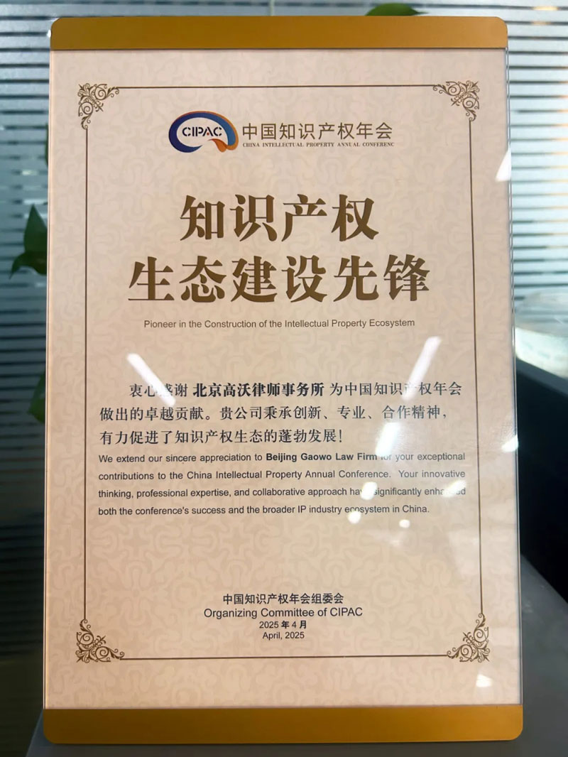 The organizing committee of the China Intellectual Property Annual Conference expressed sincere gratitude to Beijing Gaowo Law Firm for their outstanding contributions to the conference. Your company adheres to the spirit of innovation, professionalism, and cooperation, which has effectively promoted the vigorous development of the intellectual property ecosystem!