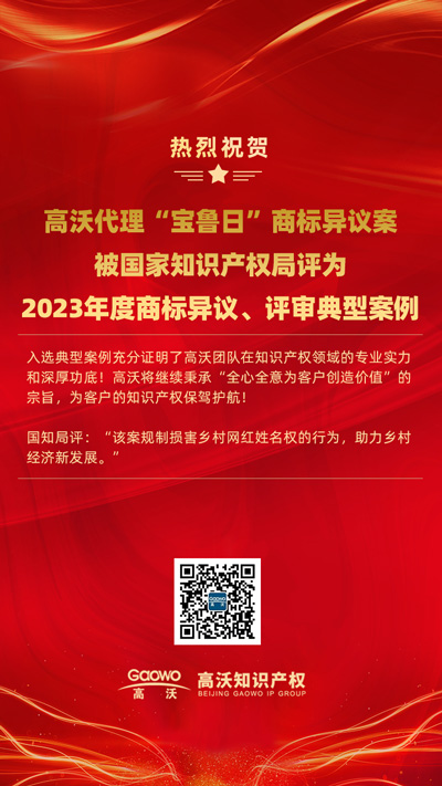 Good news! The Baoluri trademark objection case represented by Gaowo was rated as a typical case of trademark objection and review in 2023 by the China National Intellectual Property Administration, which regulated the behavior of damaging the right to name of rural online celebrities and helped the new development of rural economy.