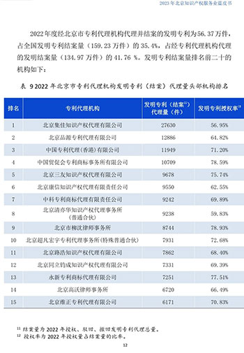 On December 7, 2023, the Beijing Intellectual Property Service Industry Work Conference, hosted by the Beijing Municipal Intellectual Property Bureau, came to a successful conclusion, during which the 2023 Beijing Intellectual Property Service Industry Blue Book was released. Beijing Gaowo Law Firm stood out from 952 agencies in Beijing due to its advantage in the number of authorized and closed patent agents, and was listed as one of the top patent agencies in Beijing in 2022.