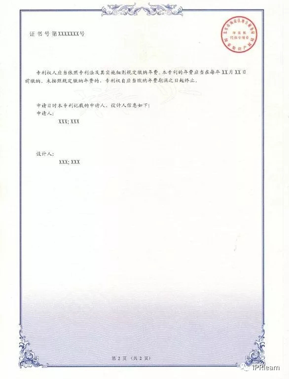 4. The revised patent certificates and the certified copies of patent certificates will not be furnished with envelop, but still in A4 format and vertical typesetting. And it changes from printing on only a single face to print on front and back , and there is only frame and no logos or seals on the back. And on the original place of the stamp duty mark it adds a dimensional barcode and the stamp duty mark is moved to the back of a patent certificate. Besides, the information of the applicant, inventor or designer of the patent application is also added on the back of a revised patent certificate.