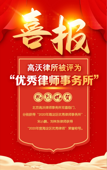 Beijing Gaowo Law Firm is double happy for it was awarded the title of "Outstanding Law Firm" in China and its Attorney Song Xiaopeng and Attorney Liu Lindong were awarded the honorary title of "Outstanding Attorney of Haidian District in 2020". Congratulations!