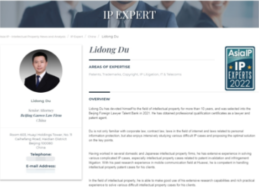 Recently, the authoritative IP media,Asia IP, released the 2022 the IP Experts TOP100 CHINA list. And the lawyer Lidong Du in Gaowo law firm with excellent expertise, has been highly recognized and recommended by the legal counsel of the world's famous enterprises and colleagues in the intellectual property industry, and won the award of Asia IP "Top 100 IP Experts in China".