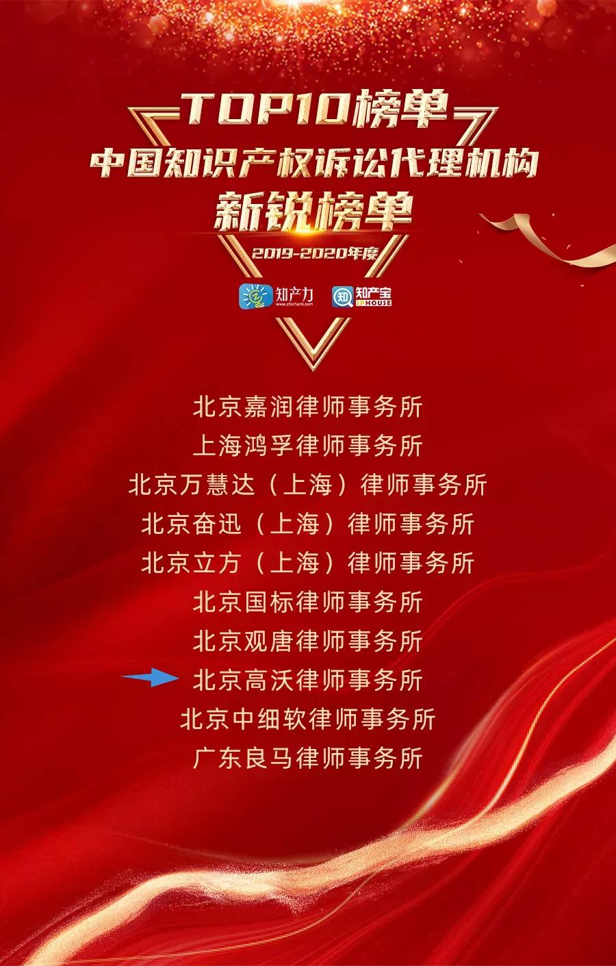 Good news!After more than half a year's selection and participation of nearly 300 agencies and teams, the 2019-2020 TOP10 newcomer list of China's Intellectual Property litigation agencies/teams has recently been released.On the basis of considering the comprehensive dimension, Beijing Gaowo Law Firm was selected in the TOP 10 newcomer list of leading law firms of 2019-2020.(in random order )